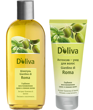 Интенсив-уход для волос D‘oliva серии Giardino di Roma содержит тосканское оливковое масло холодного отжима, экстракты базилика и ромашки, а также биотин, который прекрасно справляется с уходом за сухими и поврежденными волосами от корней и до самых кончиков. После использования интенсив-ухода D‘oliva волосы не спутываются, а каждое применение все больше увеличивает их блеск, объем и жизненную силу.